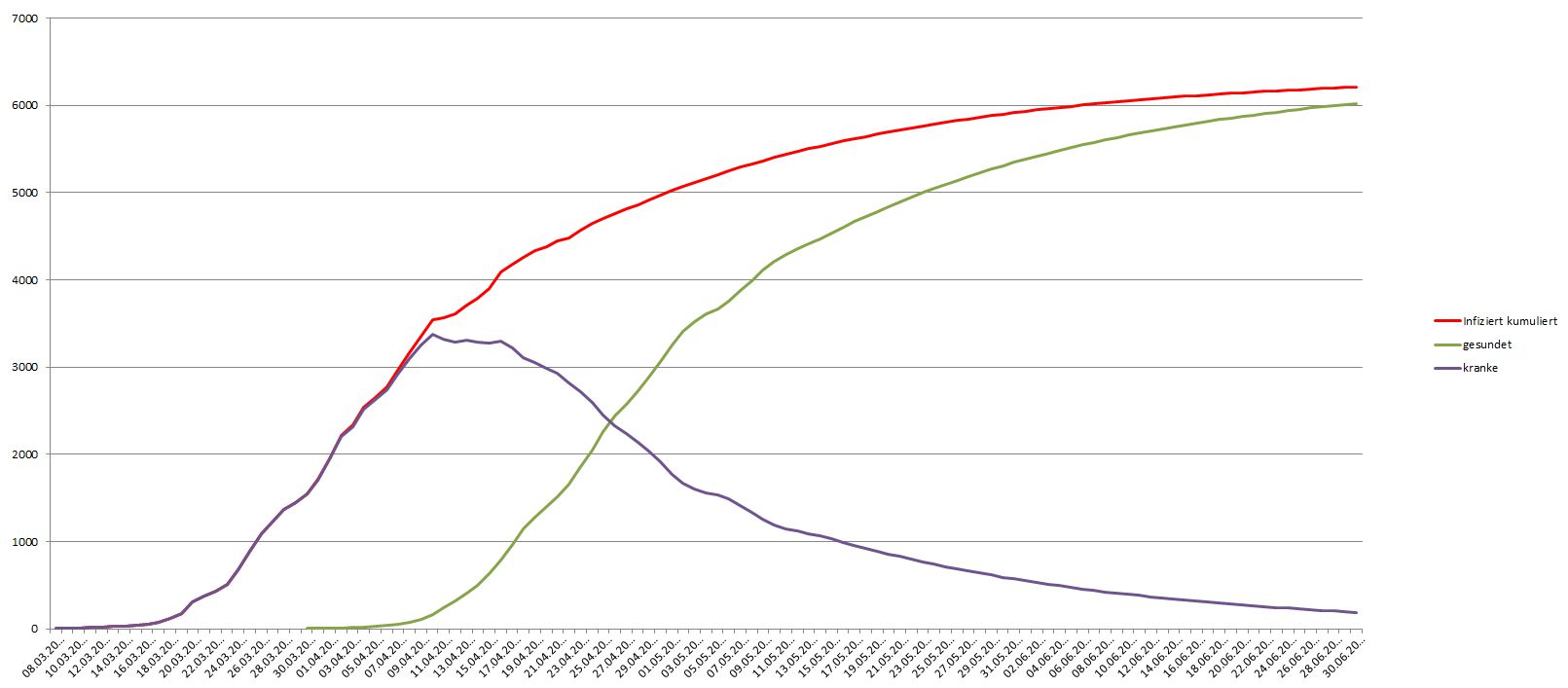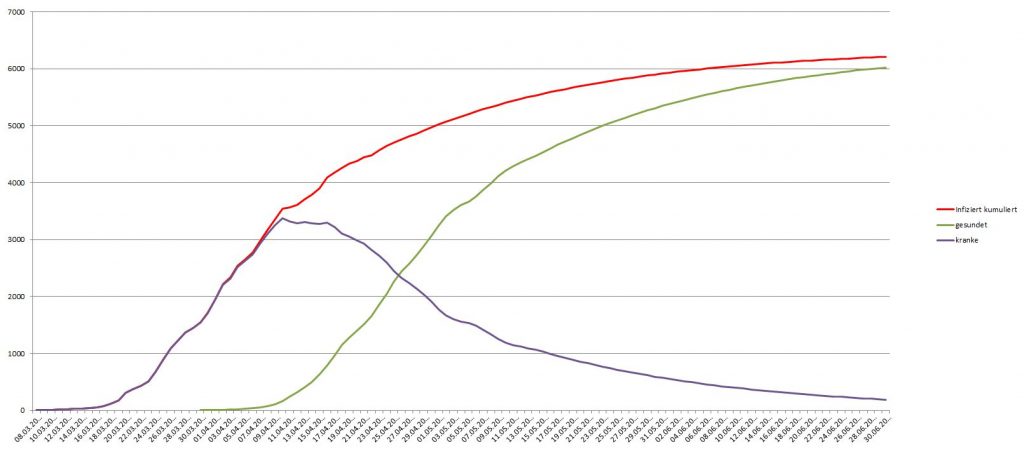 Aber jetzt setzt etwas anderes ein, etwas, das an kaum einer Stelle wirklich und deutlich erwähnt wird: die Kranken werden auch mal wieder gesund oder, leider kommt auch das vor, sterben. Ich habe mal angenommen, dass ein Infizierter nach spätesten drei Wochen wieder gesund ist; leichte Fälle schneller, schwere länger (Quelle Robert Koch Institut). Drei Wochen im Mittel ist vermutlich als vereinfachte Annahme kein schlechter Wert.